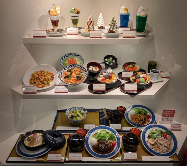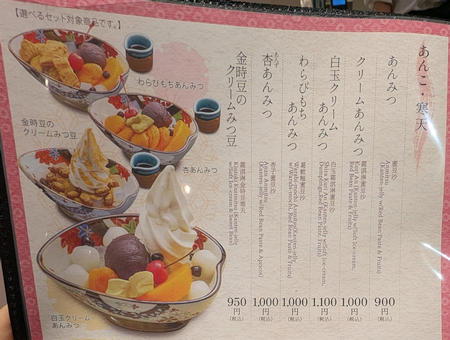 メニューディスプレイはこんなラインアップ。「パフェ」や「あんみつ」が目を引きますが、「麺」類や「ハンバーグ」や「生姜焼き」といった「御膳」メニューもあります。
