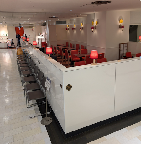細長いスペースをどうレイアウトするのかと思っていましたが、低めのパーティションで囲って客席数を確保したのですね。買物疲れを癒すのにもちょうどいいかも。