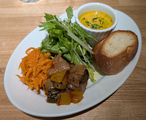 サラダ、ラタトゥーユ、ラペ、冷製スープ、パンと見事なバランスのワンプレート。