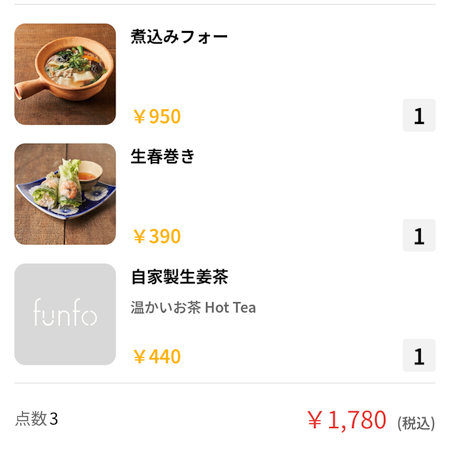 お約束の QRコードでのスマホオーダー。せっかくなので「生春巻き」と「自家製生姜茶」も一緒に注文。