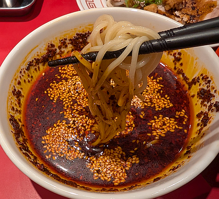 つけ汁は冷麺を連想させる「お酢」の酸味が効いており、そこにラー油とゴマをたっぷり加えた感じ。見た目通りの辛さですが、でも、麺や具材と一緒に食べれば私には好みの辛さです。