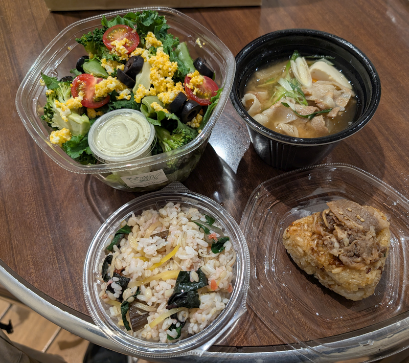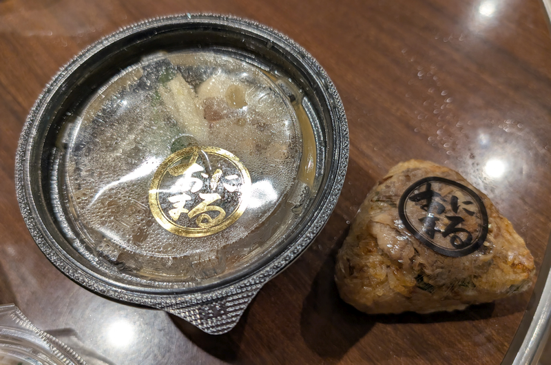 「汁物」が欲しくなると思って、事前に「おにまる」で「味噌汁」と「焼むすび」を購入(615円)しておきました。