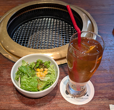 まずはサラダが烏龍茶と一緒に登場。スターターにぴったり。