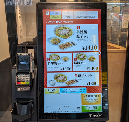 この選択だと「おいしいラーメン」で固定なので、「ラーメン」画面に切り替えて「野菜いっぱいラーメン」を選び、そこに「半炒飯・餃子」を追加しました。