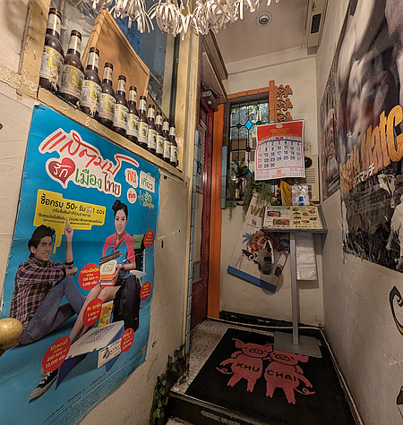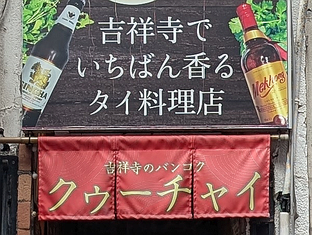 場所は吉祥寺駅南口を出てすぐ「パークロード」を右方向に数分歩くと、右手に細長い「クゥーチャイ」の看板と赤い暖簾が目に入ります。