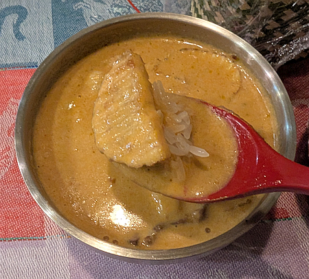 ちぎってカレーに浸けてみましたが、最初は熱すぎて大変。モチっと食感とトロっとした「グリーンカレー」のコクと辛さが馴染んでおいしい。