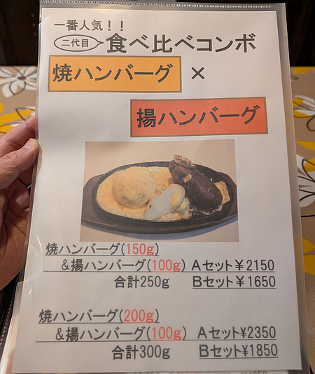 そしてこちらが「焼ハンバーグ(150g)x揚ハンバーグ(100g)」。