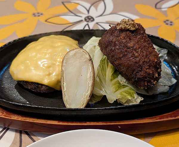 サラダとチーズハンバーグが食べたくて再訪。すると「焼ハンバーグx揚ハンバーグ」というメニューがあり、気になるので頼んでみました。いつの間にか「一番人気」らしいです。