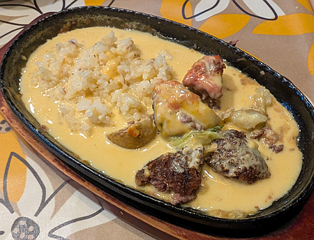 後半は「お約束」で五穀米のごはんを鉄板に入れ、追いチーズでリゾットに。