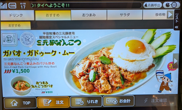 オーダーは今どきのタッチパネル。最初は定番「ガパオ」にしようかと思ったのですが「ミニガパオ」を発見!