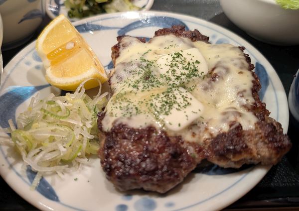 ダブルサイズ(440g)は多いので、レギュラー(220g 1,400円)をチョイス。チーズをトッピング(100円)して、ミニサラダ(250円)も付けました。