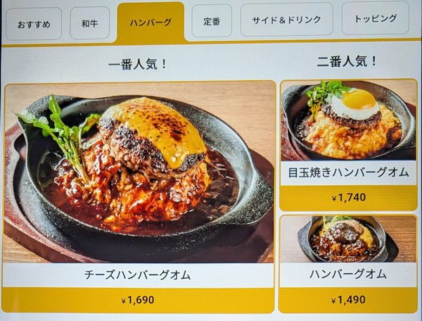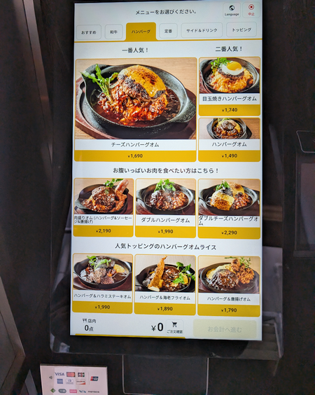「ハンバーグオム」が基本で、あとはハンバーグを和牛にするか、そこにチーズや目玉焼き乗せるか、さらにステーキ、ソーセージ、唐揚げ、エビフライなどを組み合わせにするかという選択になる様子。
