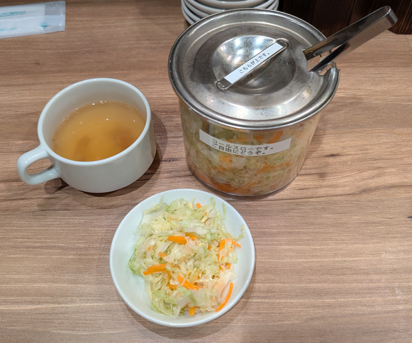 最初にスープが運ばれてきました。コールスローはテーブルに置かれた容器から自由にとれます。