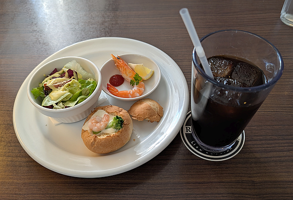 まずは「フリーリフィルドリンク」の「アイスコーヒー」に「ミニシーザーサラダ」「シュリンプフォンデュ」「ボイルドシュリンプ」の前菜が登場。