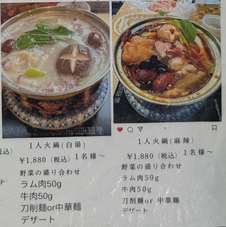 2つのスープを楽しめる「仕切り鍋」のコースもありますが、「2名様から」となっています。