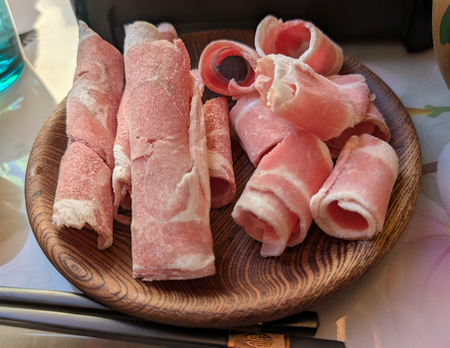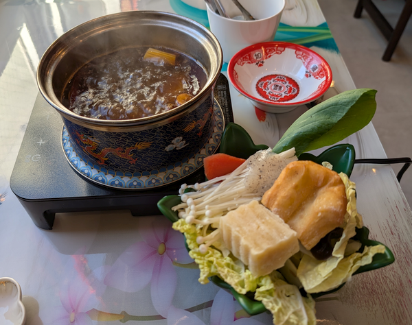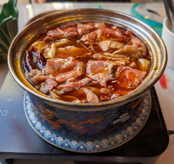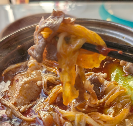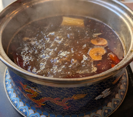 スープは煮立っています。直接、嗅ぐとむせるほどで、まさに「火鍋」です。