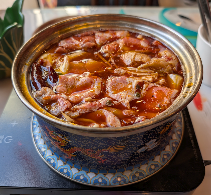 スープは煮立っています。直接、嗅ぐとむせるほどで、まさに「火鍋」です。