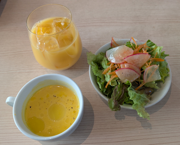 暖かいパンプキンスープ。おいしいです。サラダもきちんとしています。