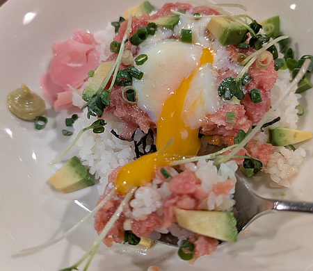 以前、カレーとハンバーグは食べたので、今回は「温玉アボカドねぎとろ丼」。このご時世、サラダとドリンク付きで 1,300円はありがたいです。