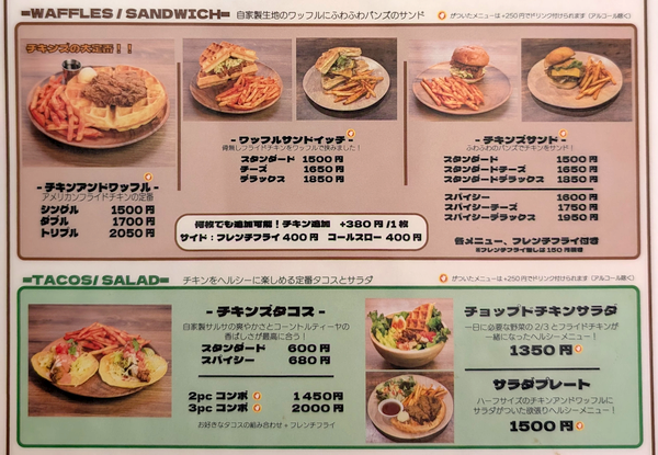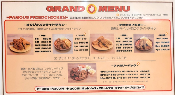 基本のフライドチキンは骨付きの「オリジナル」と骨無しの「チキンフィンガー」があり、「コンボ」としてサイドとなる「コールスロー」「ワッフル」をつけることができるようです。