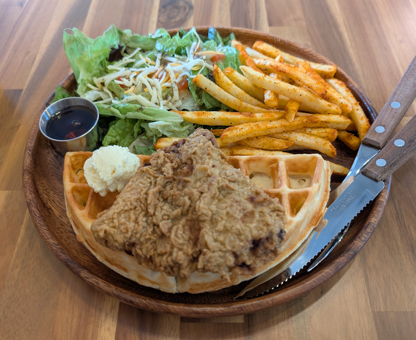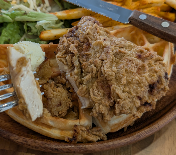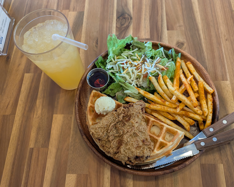 フライドチキンとワッフル、サラダとポテトのバランスよし