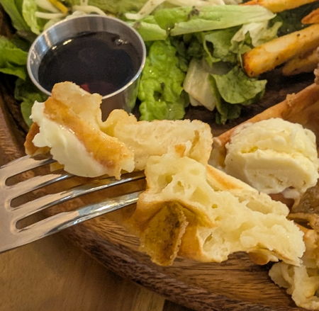ワッフルはふんわり系。フライドチキンとの組み合わせは新鮮な感じで面白いです。