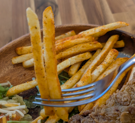 ポテトはホットチリ系のスパイスで食が進みます。