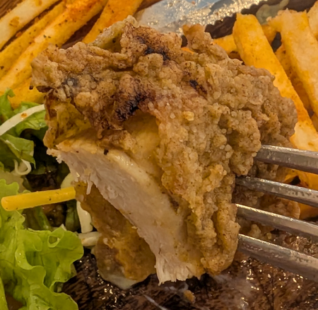 フライドチキンの衣は「カリッ」というより、「ガリッ」という感じで、しっかりした歯ごたえ。ナイフで切ると衣が外れてしまうのが少し残念。