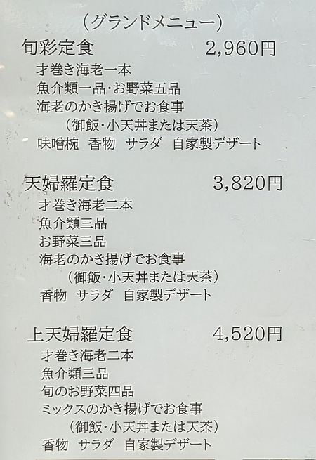 でも「才巻き海老一本」を含む「旬彩定食(2,960円)」でもいいし、ご褒美なら「上天婦羅定食」もありですね。