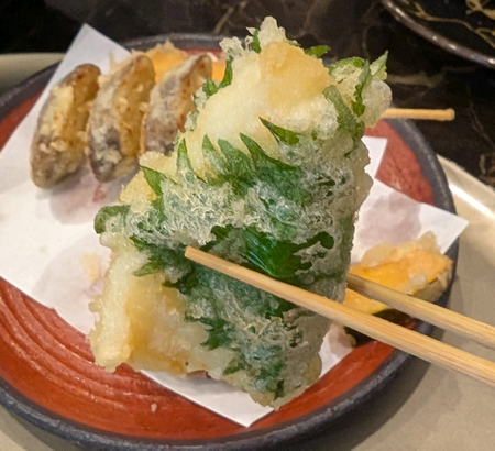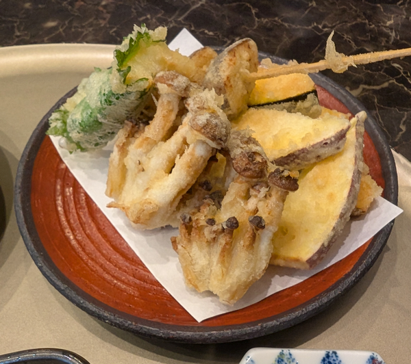 サラダを食べ終えたタイミングで「魚介類一品と野菜四品の盛合わせ」が登場。野菜はブナシメジにサツマイモ、ゴボウにカボチャ。いい感じで揚がっています。