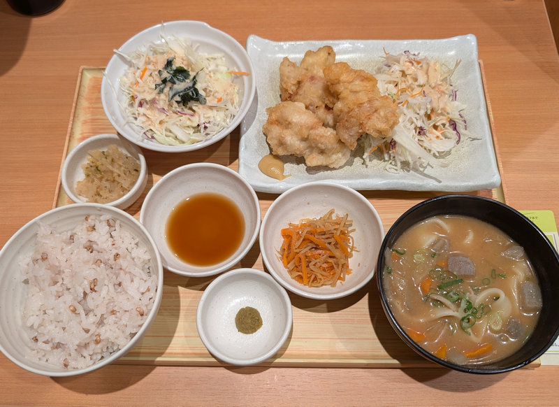 こちらが「大分とり天 と だんご汁 定食」+野菜サラダ。